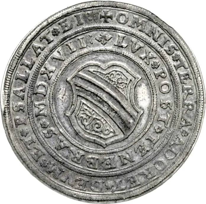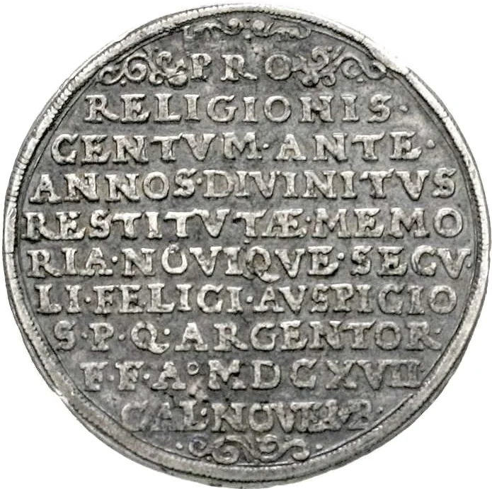 PRO/ RELIGIONIS/ CENTUM ANTE/ ANNOS DIVINITUS RESTITVTAE MEMO/ RIA NOVIQUE SECVLI FELICI AVSPICIO/ S P Q ARGENTOR / F F A MDCXVII/ CAL NOVEMB