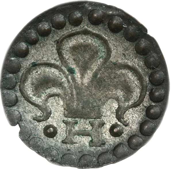 Fleur-de-lis on an "H" base flanked by dots.