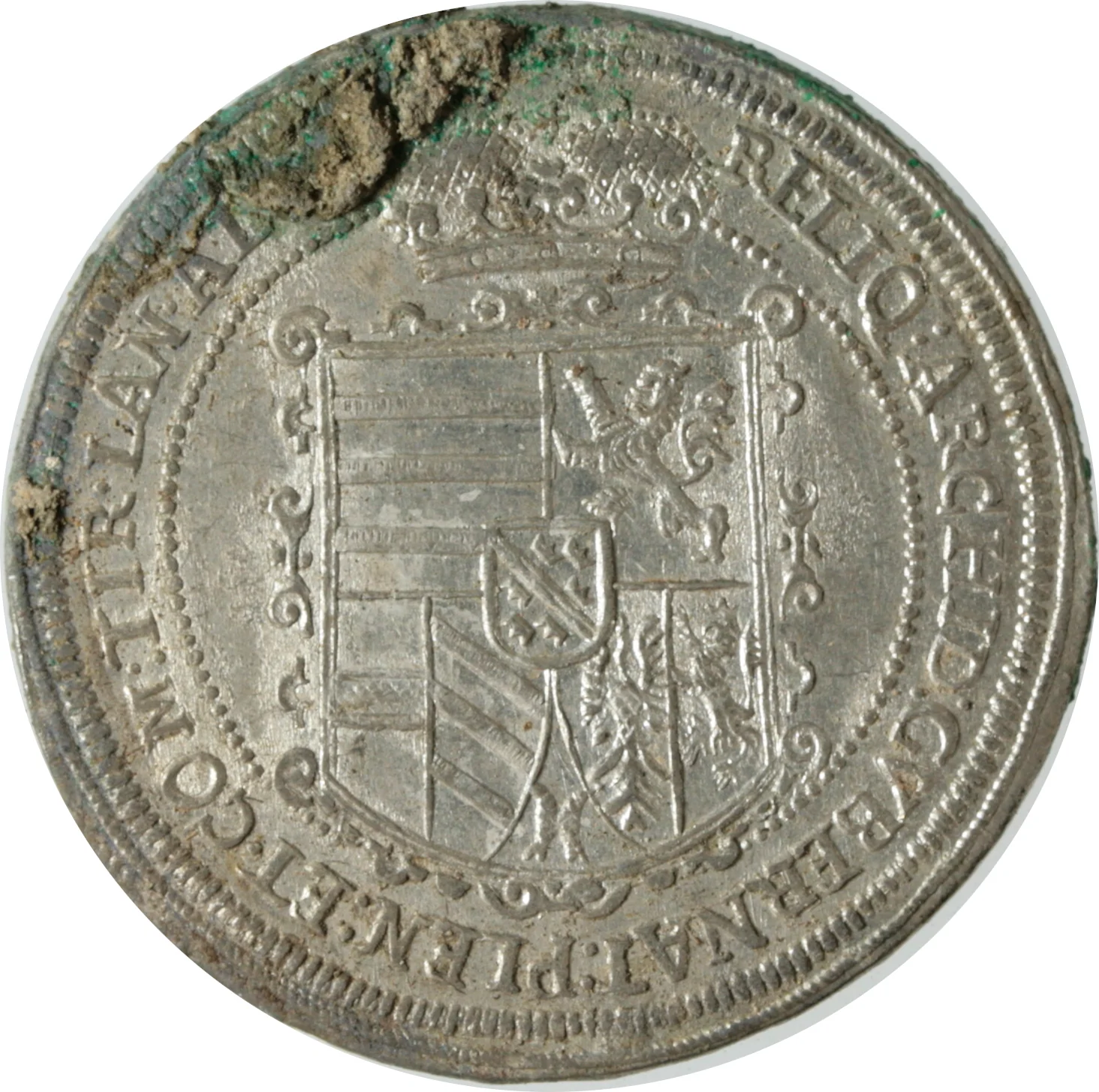 Arms of Hungary, Bohemia, Austria-Burgundy, and Tyrol-Habsburg, with Ferrette and Upper Alsace central. Beaded circle.