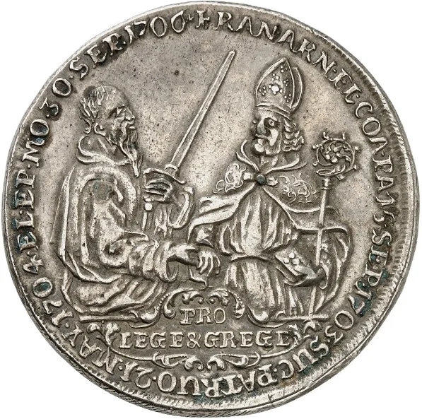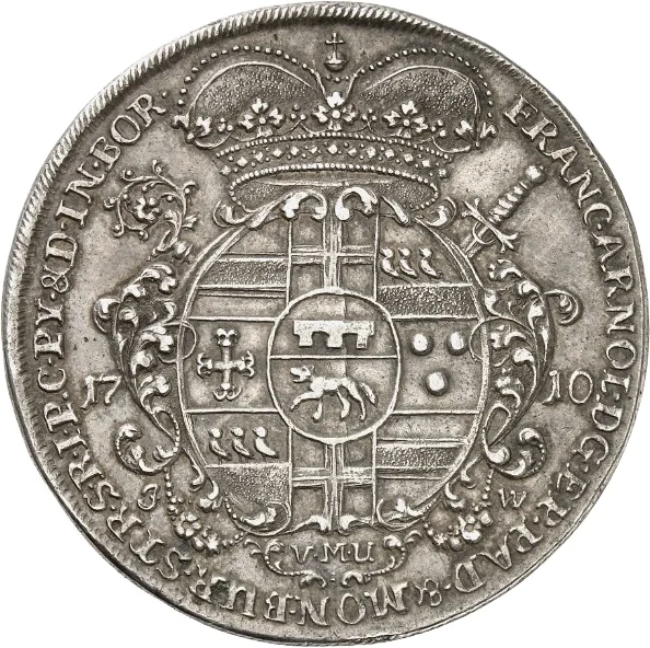 Description: Oval baroque shield with Wolff-Metternich arms, crossed sword and crozier over date; mintmaster initials flanked below, VMU cartouche beneath.