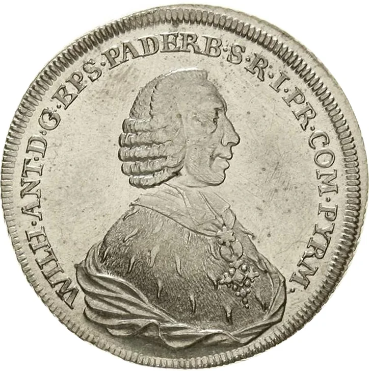 Description: Ornate shield with the quartered arms of Paderborn and Pyrmont and a central Asseburg escutcheon in a baroque frame, over crossed sword and crozier, flanking mintmaster initials, with a motto below and date in legend.