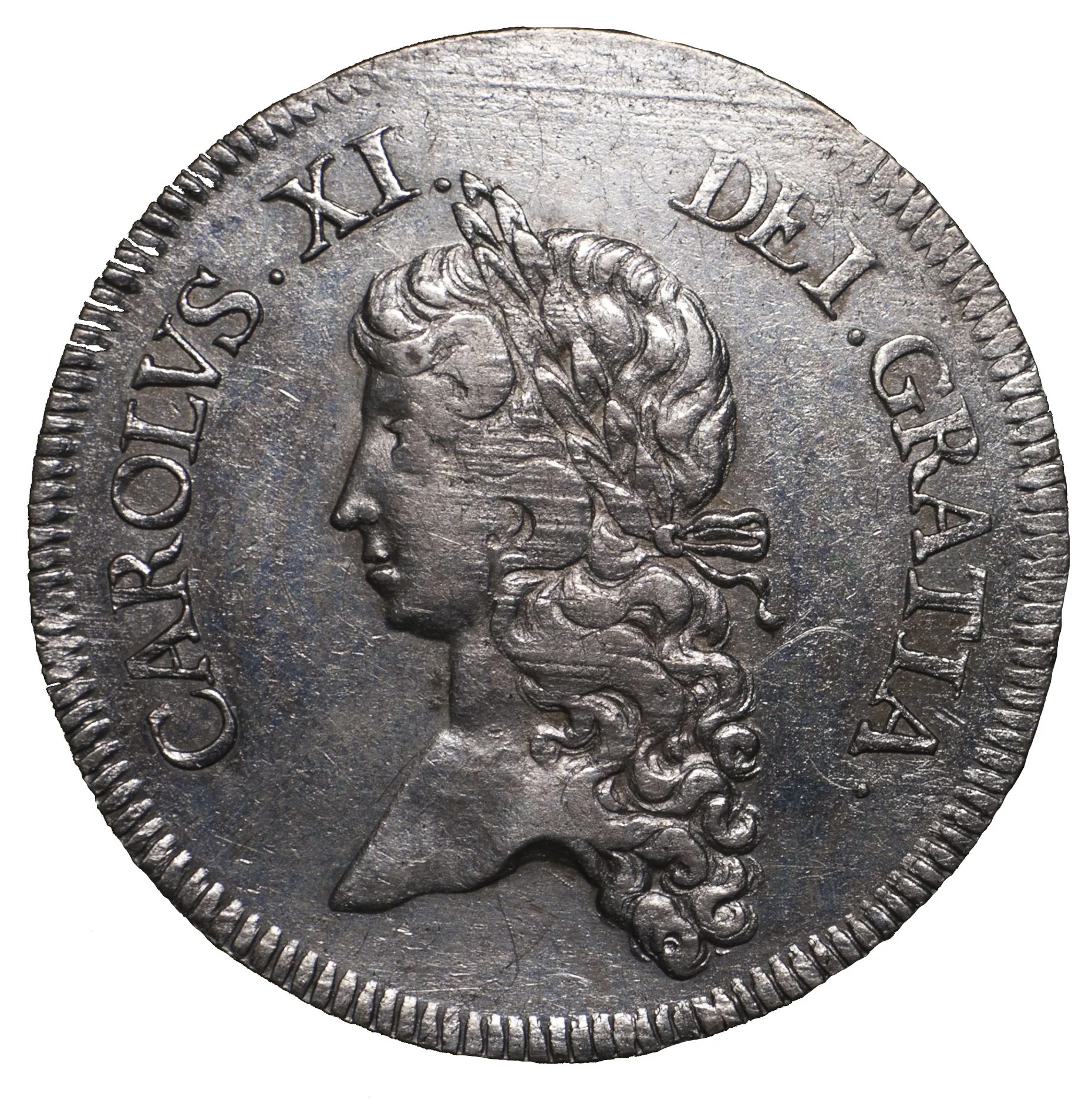 Young laureate bust of Carl XI left within encircling legend.