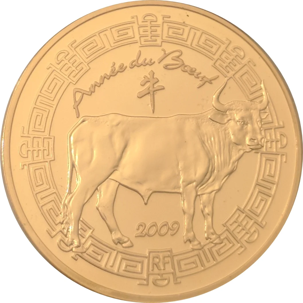 The inner coin features an ox with inscriptions for "Year of the Ox," 2009, and the character "牛," surrounded by a scroll-edge frieze.