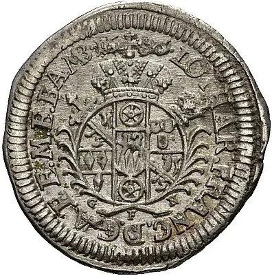Crowned oval shield of Bamberg on crossed sword and crozier, between palm branches, date above.