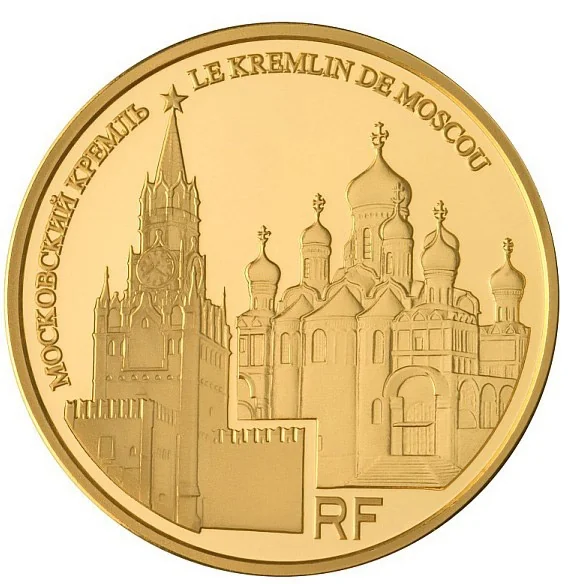 The Moscow Kremlin depicted by the Spasskaya Tower and Annunciation Church, with "RF" below. The edge reads "МОСКОВСКИЙ КРЕМЛЬ" and "THE KREMLIN OF MOSCOW" in Russian and French.