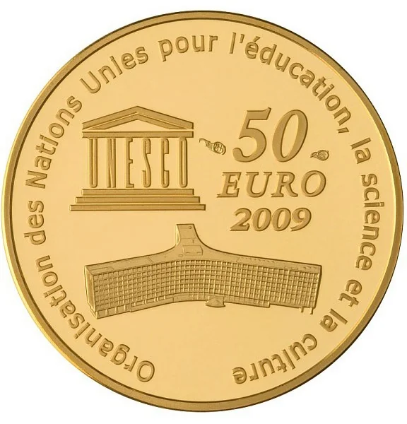 UNESCO headquarters and logo. The edge bears the organization's full name. The center features the face value "50 EURO" and the year "2009".