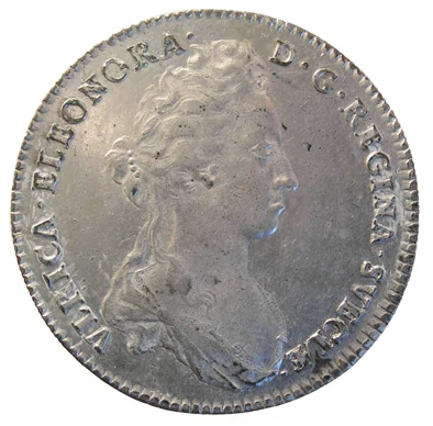 Veiled bust of Queen Ulrika Eleonora facing right within encircling legend.