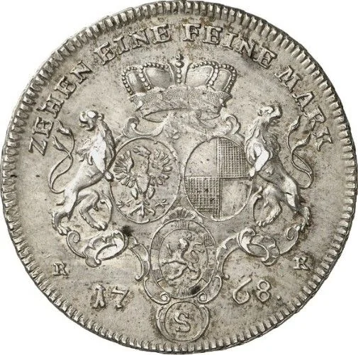 Three crowned oval shields with coats of arms, supported by lions. A circled S separates the date and mint initials.