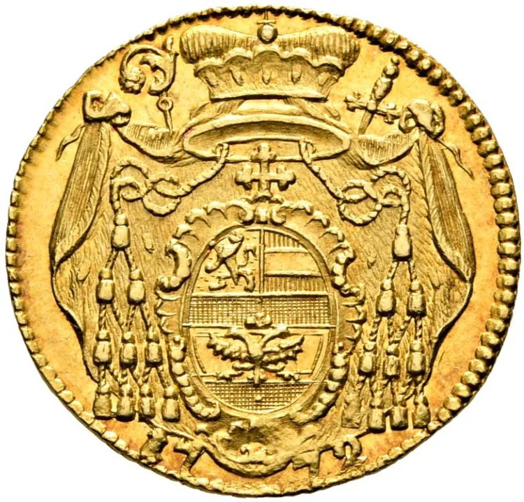 Shield with cross, archbishop's attributes above. Crowned mantle with sword and crosier behind.