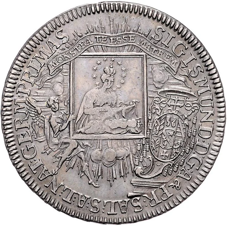 Description: Crowned Madonna and Child in a starry nimbus, within a frame. An angel supports it on the left; the archbishopric's arms with galero are on the right. Clouds and rays behind. Motto above: "MONSTRA TE ESSE MATREM" ("Show yourself to be our Mother").