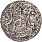 Plain arms in cartouche flanked by rosettes, mintmaster initials below.