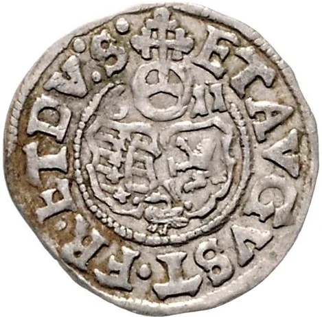 Two adjacent shields (Saxony and Thuringia), with a small imperial orb above dividing the date; titles continued.