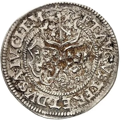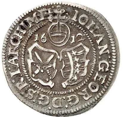 Two small shields flanking an orb above the date, encircled by Johann Georg I's titles.