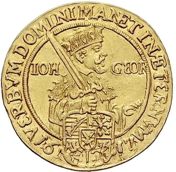 Right-facing half-figure in robe and electoral hat, holding a sword over the shoulder. Shield with quartered arms and central Saxon shield divides "IOH - GEOR" and the date.
