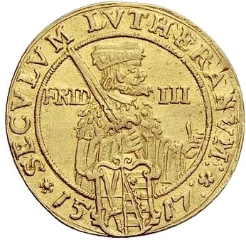 Half-length figure facing right in robe and electoral hat, holding sword over shoulder, dividing "FRID" and "III." Shield with arms of electoral and ducal Saxony in front divides "15" and "17."