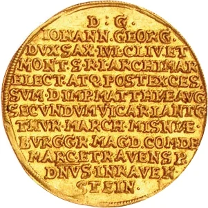 Elector on horseback right, sword on shoulder, divides date; oval shield of Saxony arms below.