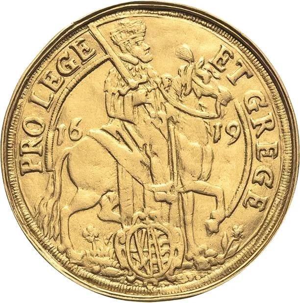 Elector on horseback, holding sword, with Saxony shield below; date in legend.
