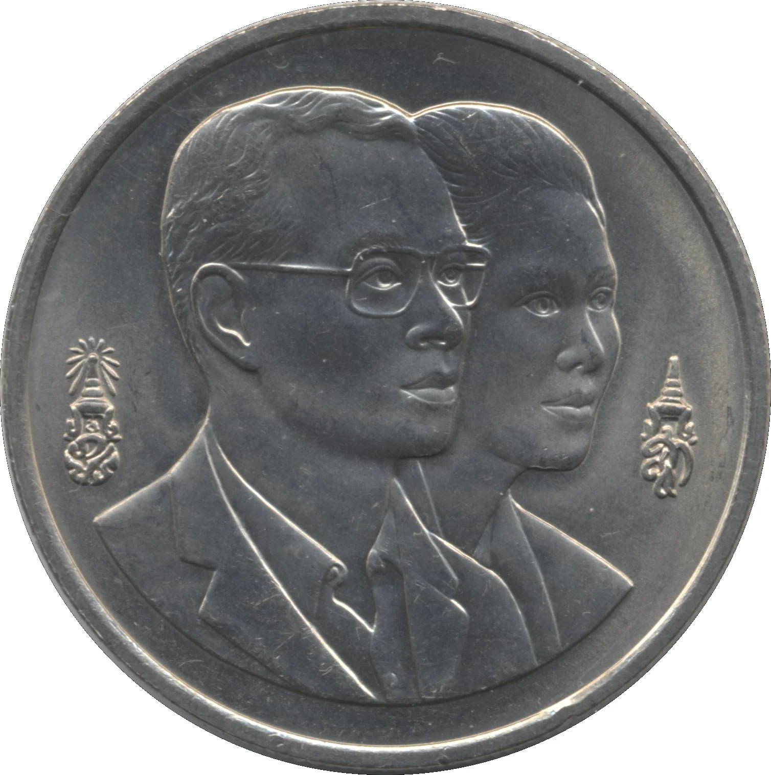 Conjoined busts of King Bhumibol and Queen Sirikit facing right, with their crowned monograms beside them.
