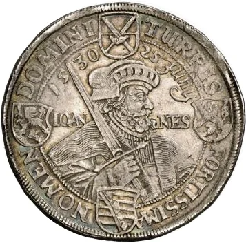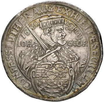 Bust of Johann Georg wearing an electoral hat, holding the electoral sword. Inscription encircles, coat of arms beneath.
