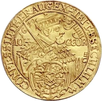 Bust of Johann Georg wearing an electoral hat, holding the electoral sword. Inscription encircles, coat of arms beneath.
