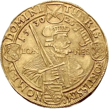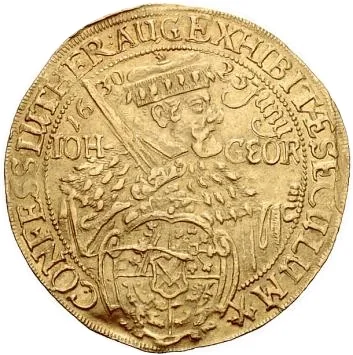 Bust of Johann Georg wearing an electoral hat, holding the electoral sword. Inscription encircles, coat of arms beneath.