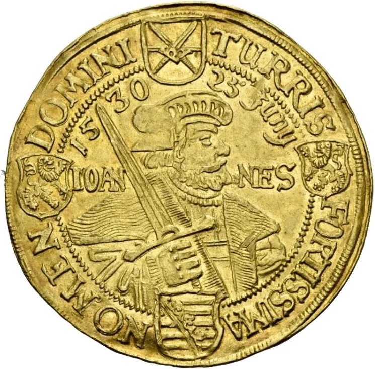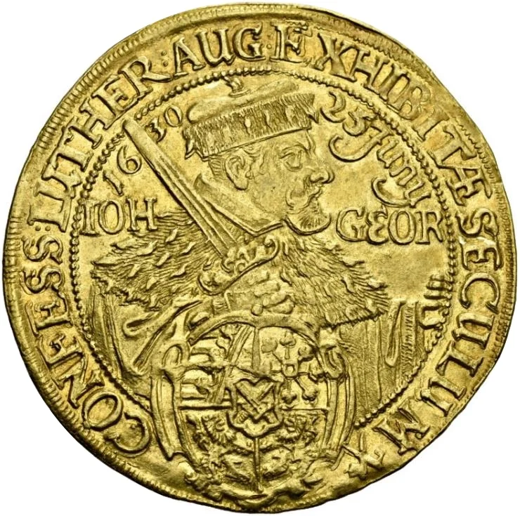 Bust of Johann Georg wearing an electoral hat, holding the electoral sword. Inscription surrounds the bust, with a coat of arms below.