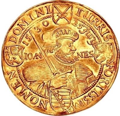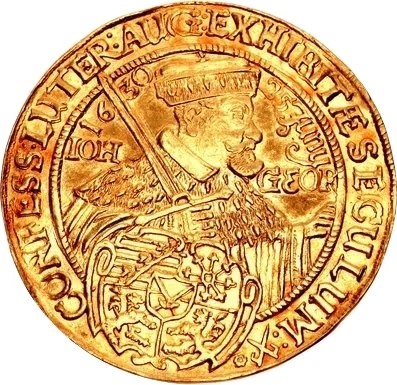 Bust of Johann Georg wearing an electoral hat, holding the electoral sword. Inscription encircles, coat of arms beneath.