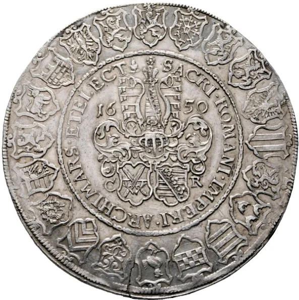 Central helmet above Electoral and Saxon arms, date above helmet, mint letters between arms, surrounded by 20 coats of arms.