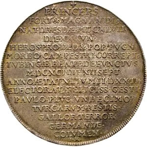 Central bust encircled by three legends.