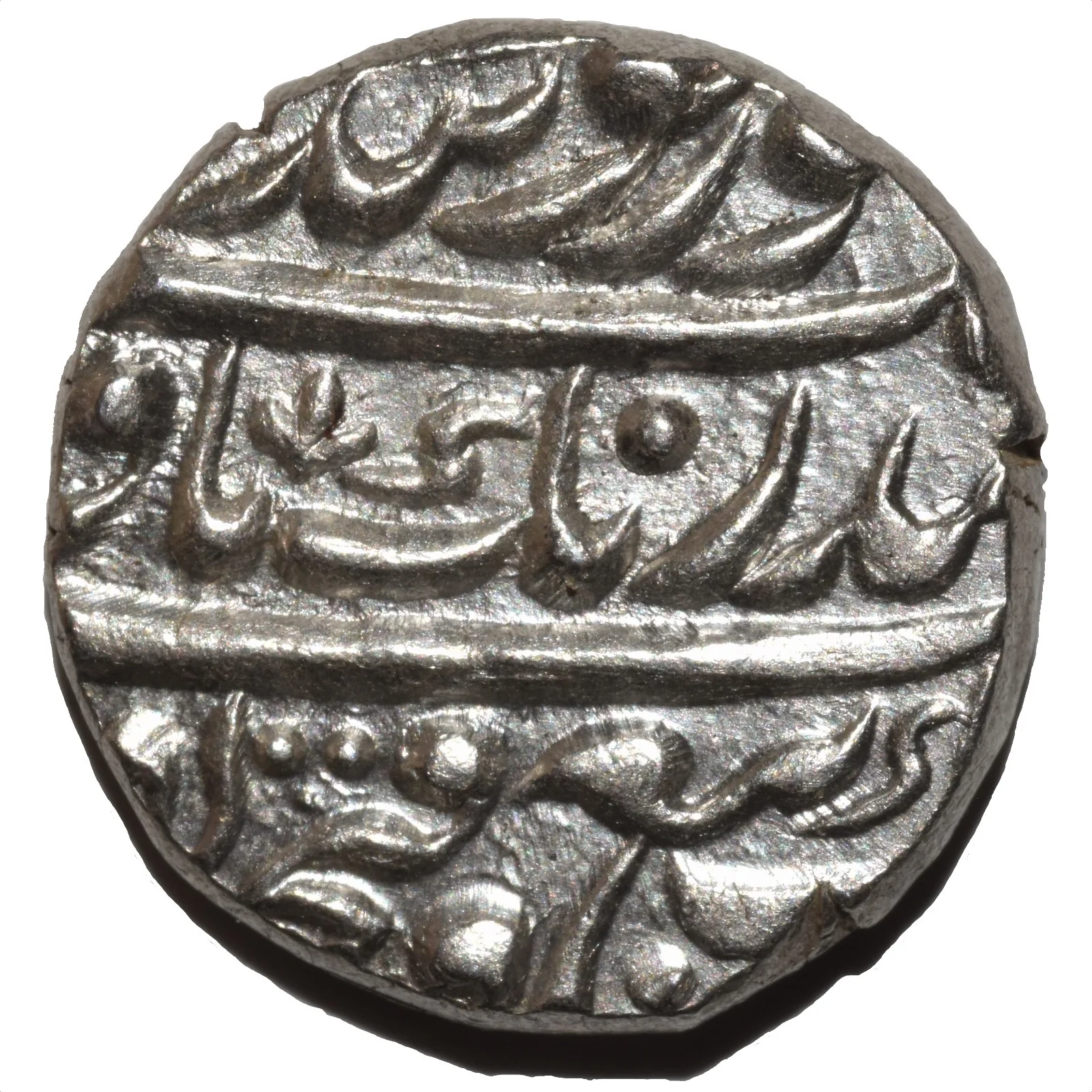 Persian legend above with Vikram Samvat 1841 and floral/mace mintmarks.