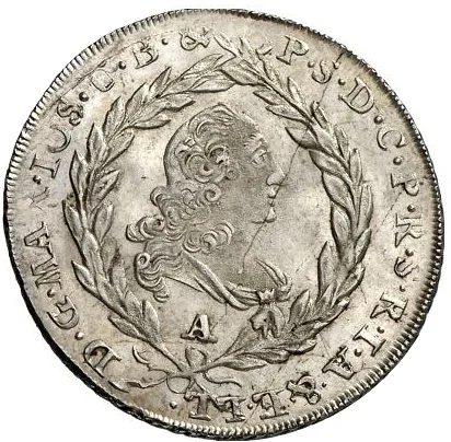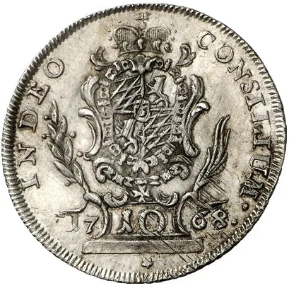 Shield with Bavarian and Palatine arms, central imperial orb, in baroque frame. Orders' chains surround it, on a pedestal with "10" flanked by date and branches.