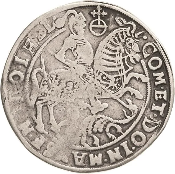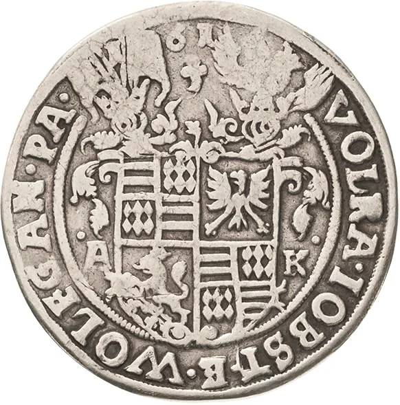 Four-fold arms flanking two helmets, with date and mintmaster's initials interspersed.