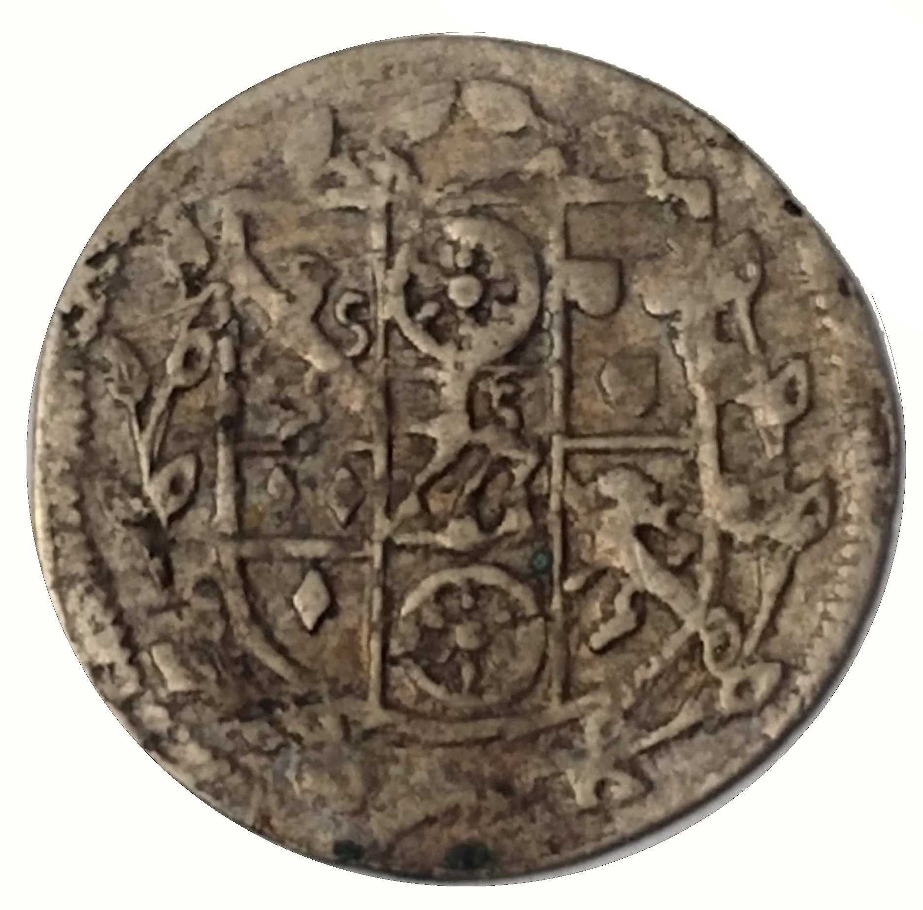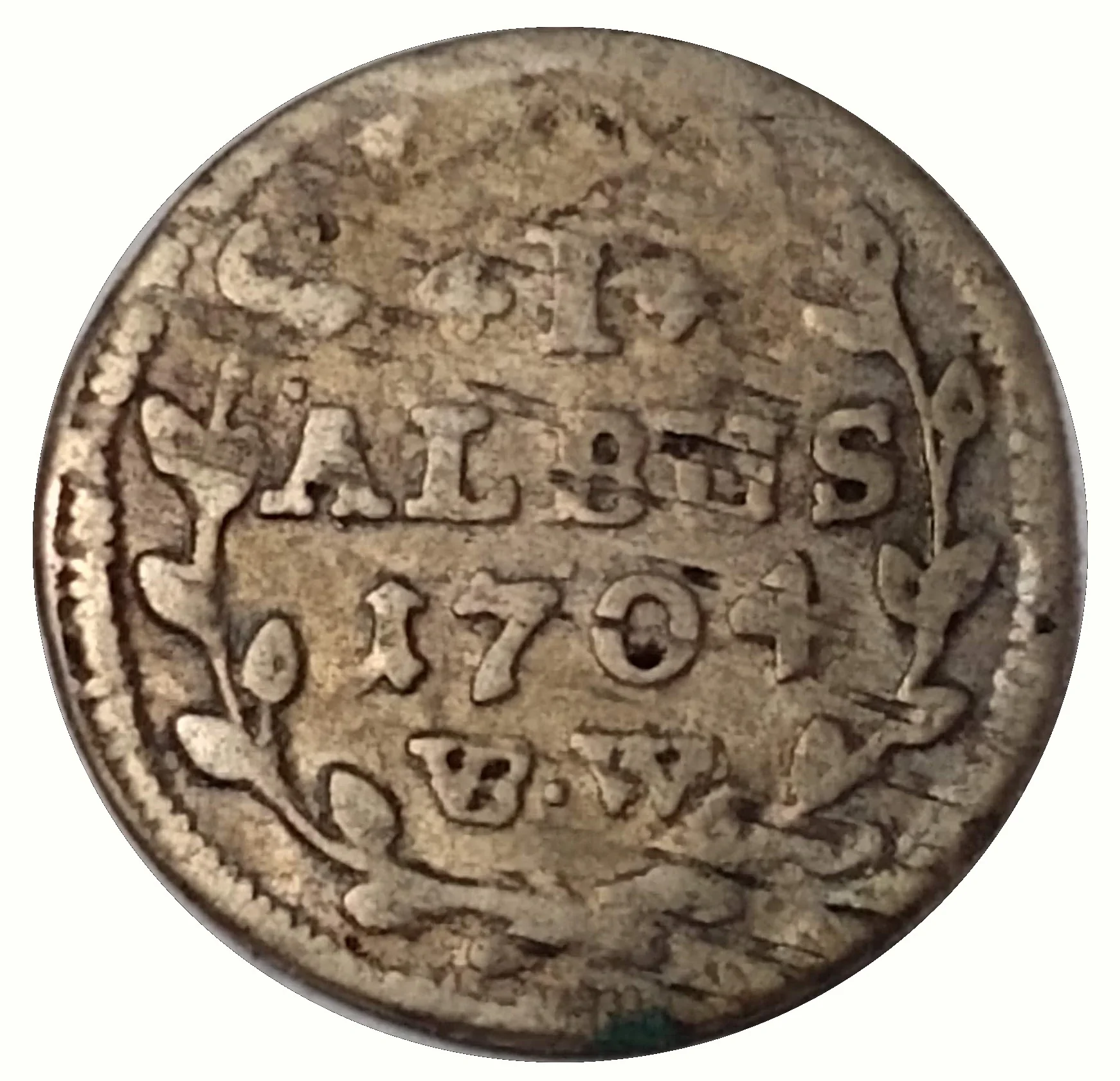 Value, date, initials in wreath.