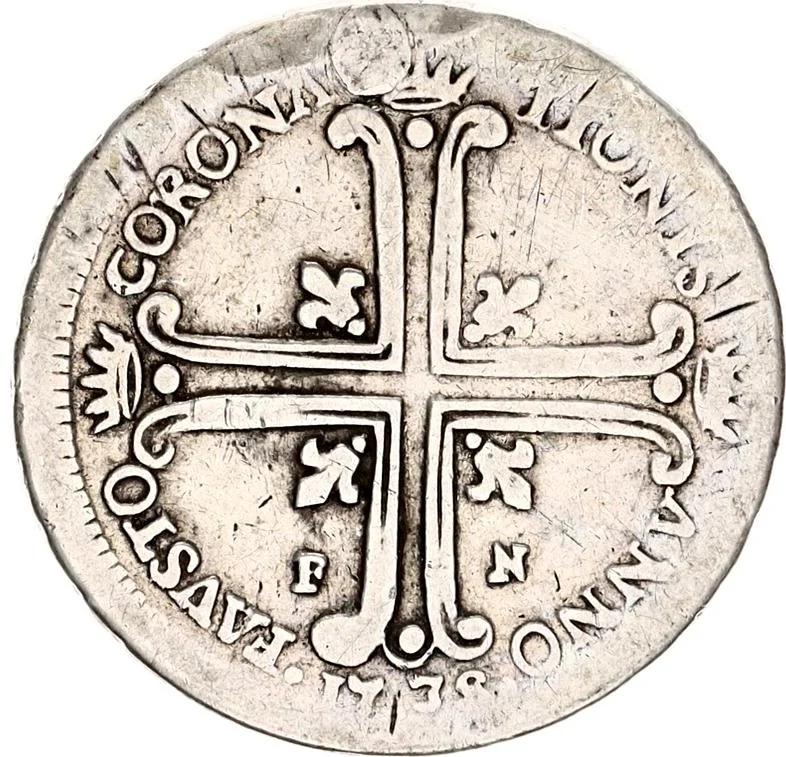 Large cross with scrolled ends, small crowns on three ends, lilies in each angle, date below.