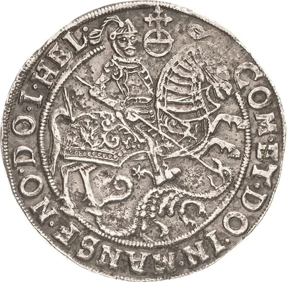Arms flank helmet, date and mintmaster initials divided by arms.