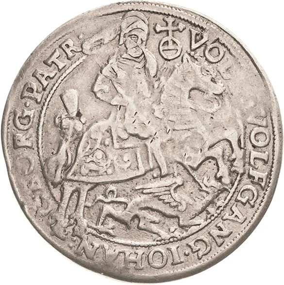 Saint George slaying dragon right, orb upper right. Legend around.