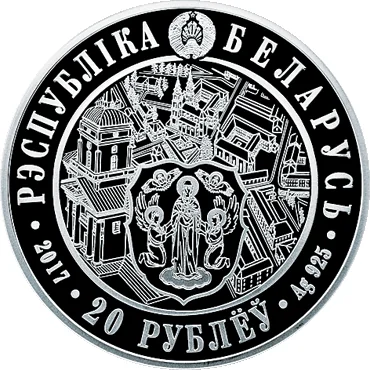 Description: Featuring the State Emblem of Belarus and the inscription "РЭСПУБЛІКА БЕЛАРУСЬ." The central layered composition shows Minsk's Upper town skyline beneath the city's coat of arms, linking its history and modernity. Flanking elements include the issue year, alloy standard, and face value.