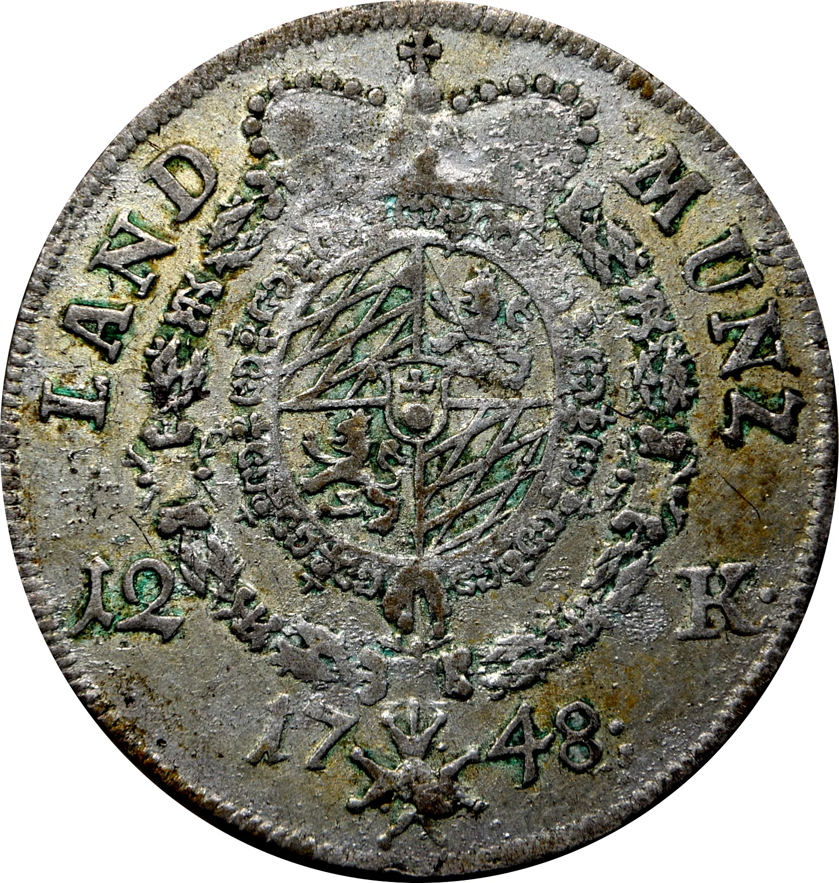 Bavarian coat of arms on a cross dividing "12 KR" and "1748," encircled by legend.