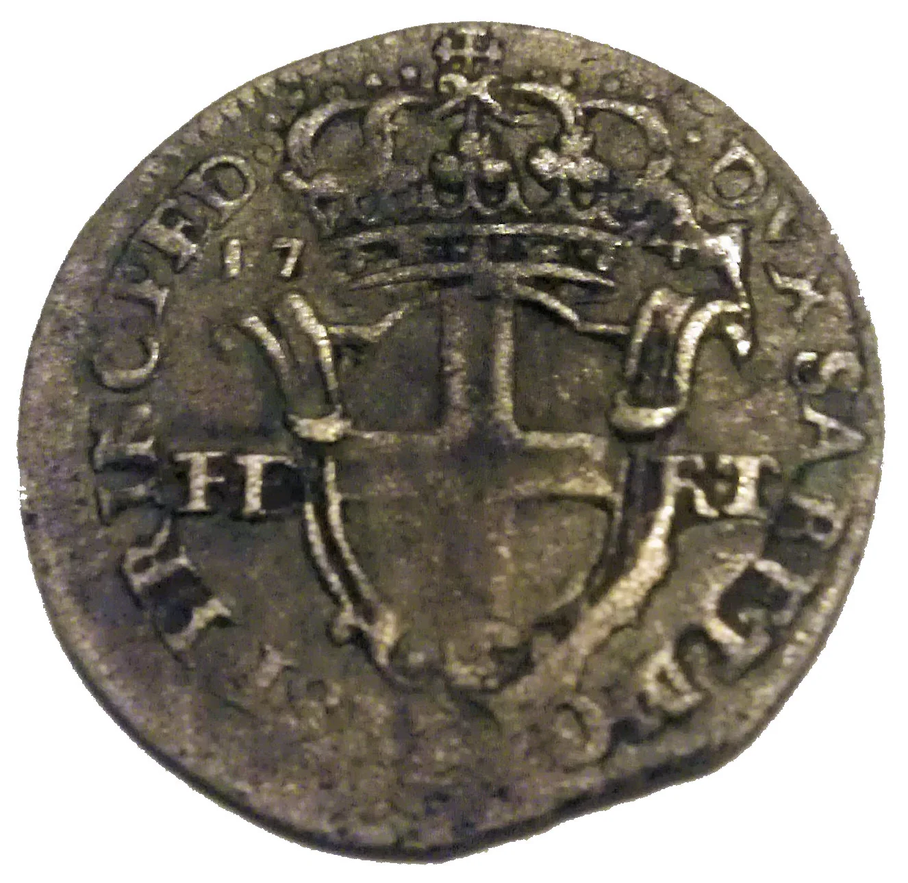 Savoy arms in oval shield, crown above divides date, FE - RT flanking.