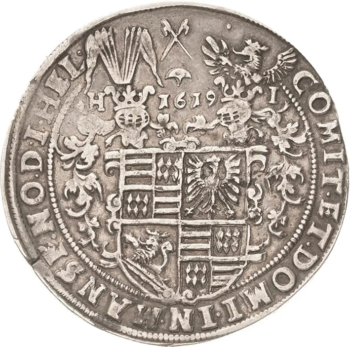 Helmeted arms, date between helmets, mintmaster initials H-I flanking helmets.