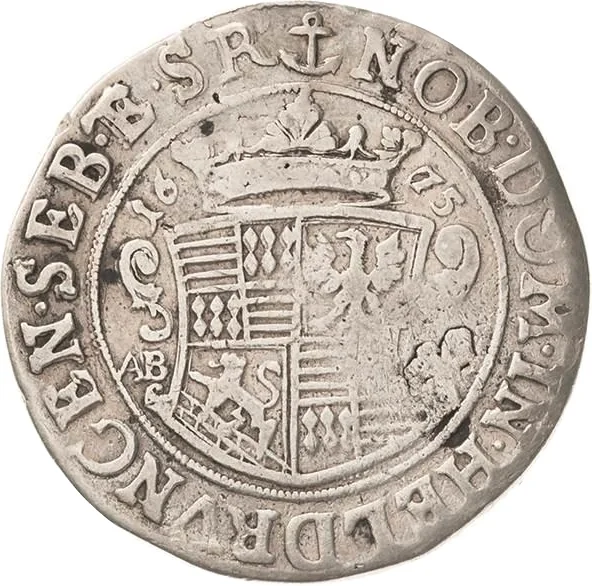 Arms flank initials, crown above divides date.