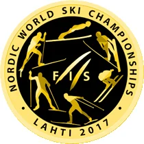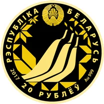 Description: Obverse: State emblem of Belarus with inscriptions "РЭСПУБЛІКА БЕЛАРУСЬ" and "20 РУБЛЁЎ," plus year. Reverse: Stylized geometric image of the Lahti ski jumps against a frosty, ornamental background.