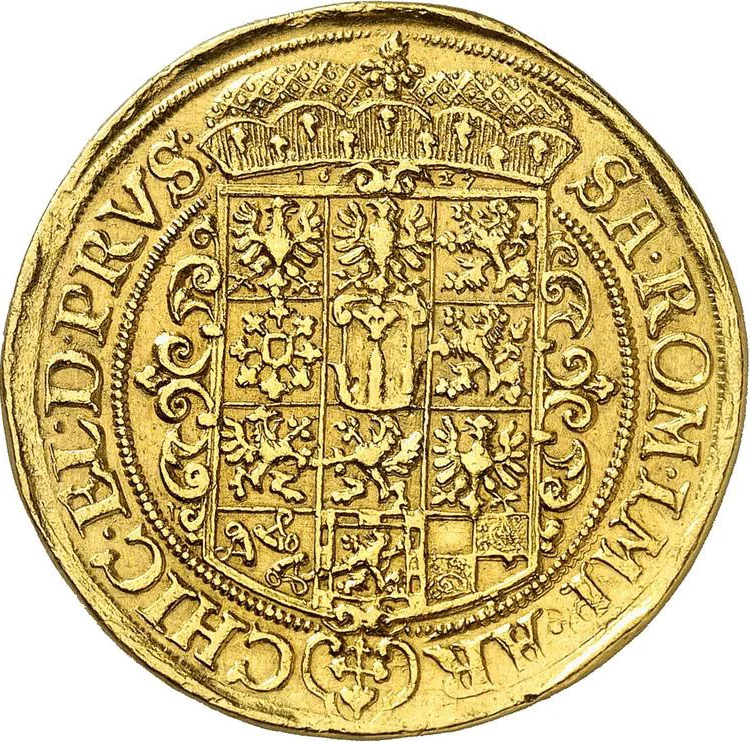 Crowned ducal hat over a twelve-field coat of arms, with the year 1627 between them.