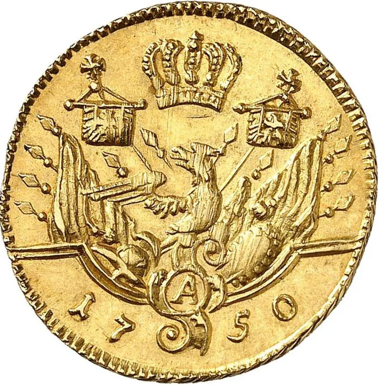 Eagle on war trophies, head left, with flags, spears, and a crown above.