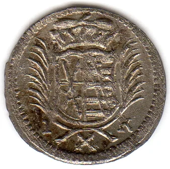Saxon coat of arms under electoral hat, flanked by palm branches, with initials and crossed arrows mint mark.