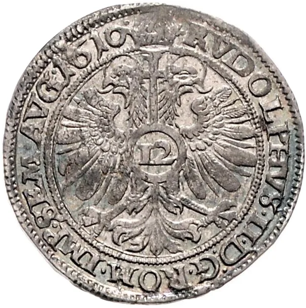 Imperial eagle with crown, orb on breast, Rudolf II's titles, dated legend.