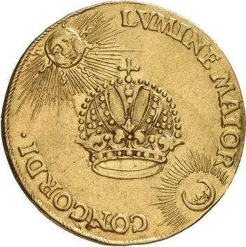 Crown centered, sun upper left, moon lower right.