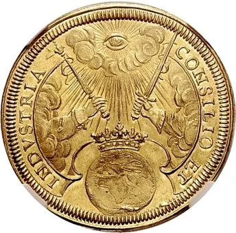 Globe crowned, flanked by a scepter and a sword.