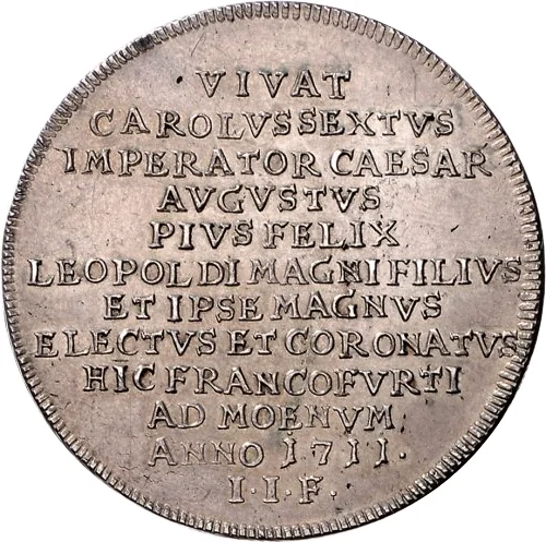 VIVAT / CAROLVS SEXTVS / IMPERATOR CAESAR / AVGVSTVS / PIVS FELIX / LEOPOLDI MAGNI FILIVS / ET IPSE MAGNVS / ELECTVS ET CORONATVS / HIC FRANCOFVRTI AD MOENVM / ANNO 1711 / I.I.F.