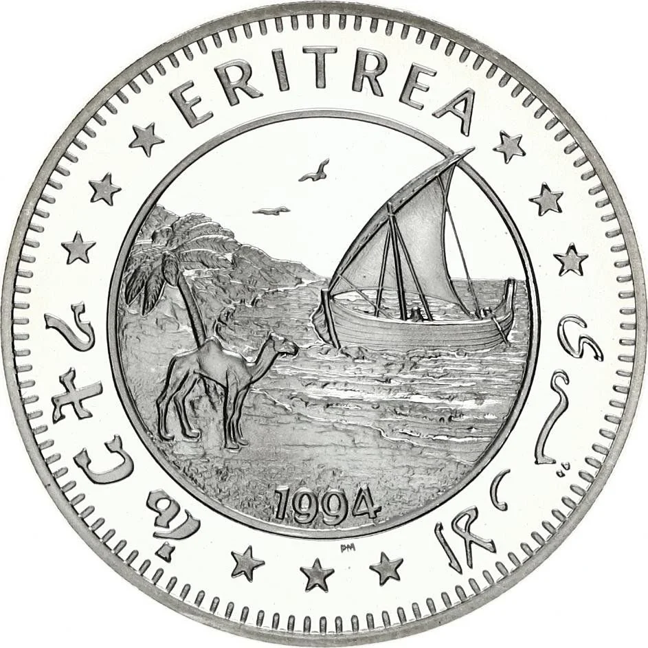 Palm, camel, and dhow in a circle. Tigrinya, English, and Arabic legend on a toothed rim.